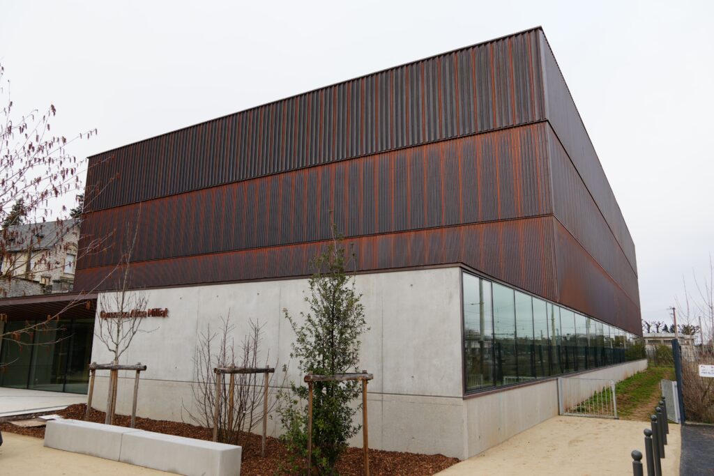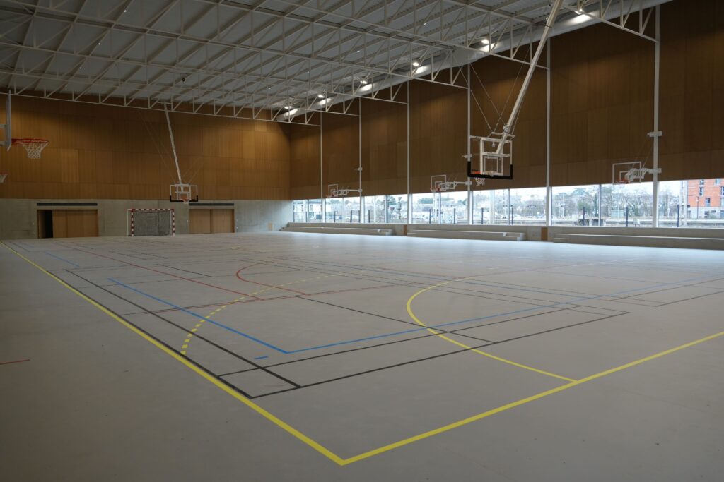 Implanté sur une ancienne friche industrielle, le gymnase s’inscrit dans une démarche de requalification urbaine et de construction durable : matériaux biosourcés, gestion intégrée des eaux pluviales, panneaux photovoltaïques… sans oublier la dimension sociale, avec plus de 2 000 heures réalisées en insertion professionnelle durant le chantier.