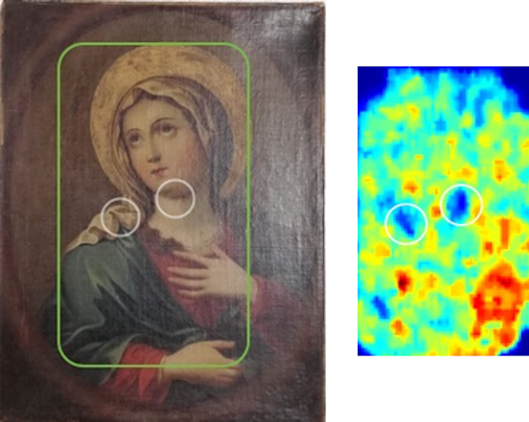 À gauche : Photographie du tableau de Fra. M. de Herrera (Mexique 1742). Rectangle vert : zone imagée par ultrasons, cercles blancs : inhomogénéités repérées par les restaurateurs de tableaux. À doite : Image en fausses couleurs de transmission ultrasonore de la partie centrale du même tableau. Couleurs chaudes : forte transmission, couleurs froides : faible transmission, cercles blancs : zones correspondant à des inhomogénéités repérées par les restaurateurs de tableaux.